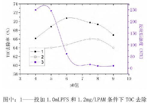 兩組實(shí)驗(yàn)攪拌結(jié)束后靜置30min取上清液測(cè)TOC濃度和濁度。結(jié)果見圖3所示。率隨pH值的變化曲線;2——投加1.4mL聚合硫酸鐵條件下TOC去除率隨pH值的變化曲線;3一一投加1.OmL聚合硫酸鐵和1.2mg/LPAM條件下反應(yīng)后濁度隨pH值的變化曲線。